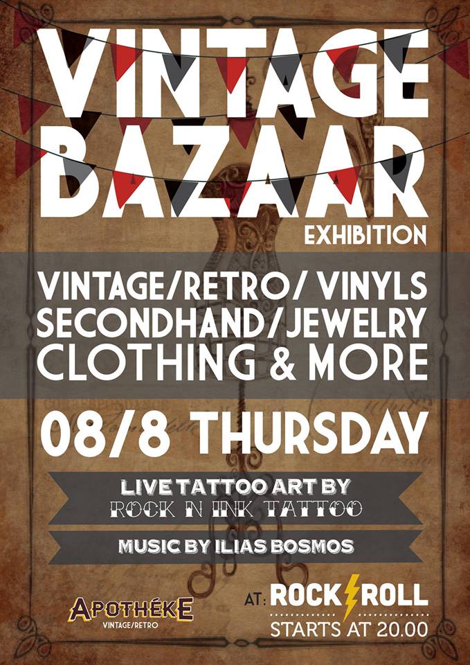 Exhibition - Vintage bazaar για πρώτη φορά στη Ρόδο! Η ομάδα Apothéke και το Rock n' Roll Music Diner πρωτοπορεί και δίνει τη μοναδική ευκαιρία στο Ροδιακό κοινό να γνωρίσει τη φιλοσοφία των vintage bazaars και να έρθει σε επαφή με προηγούμενες δεκαετίες - σταθμούς για τις σύγχρονες τάσεις και τη μόδα. Συλλεκτικά vintage και retro προϊόντα, βινύλια, ρούχα δεύτερης χρήσης, αξεσουάρ και αντικείμενα οικιακής χρήσης είναι μερικά από τα είδη της έκθεσης.